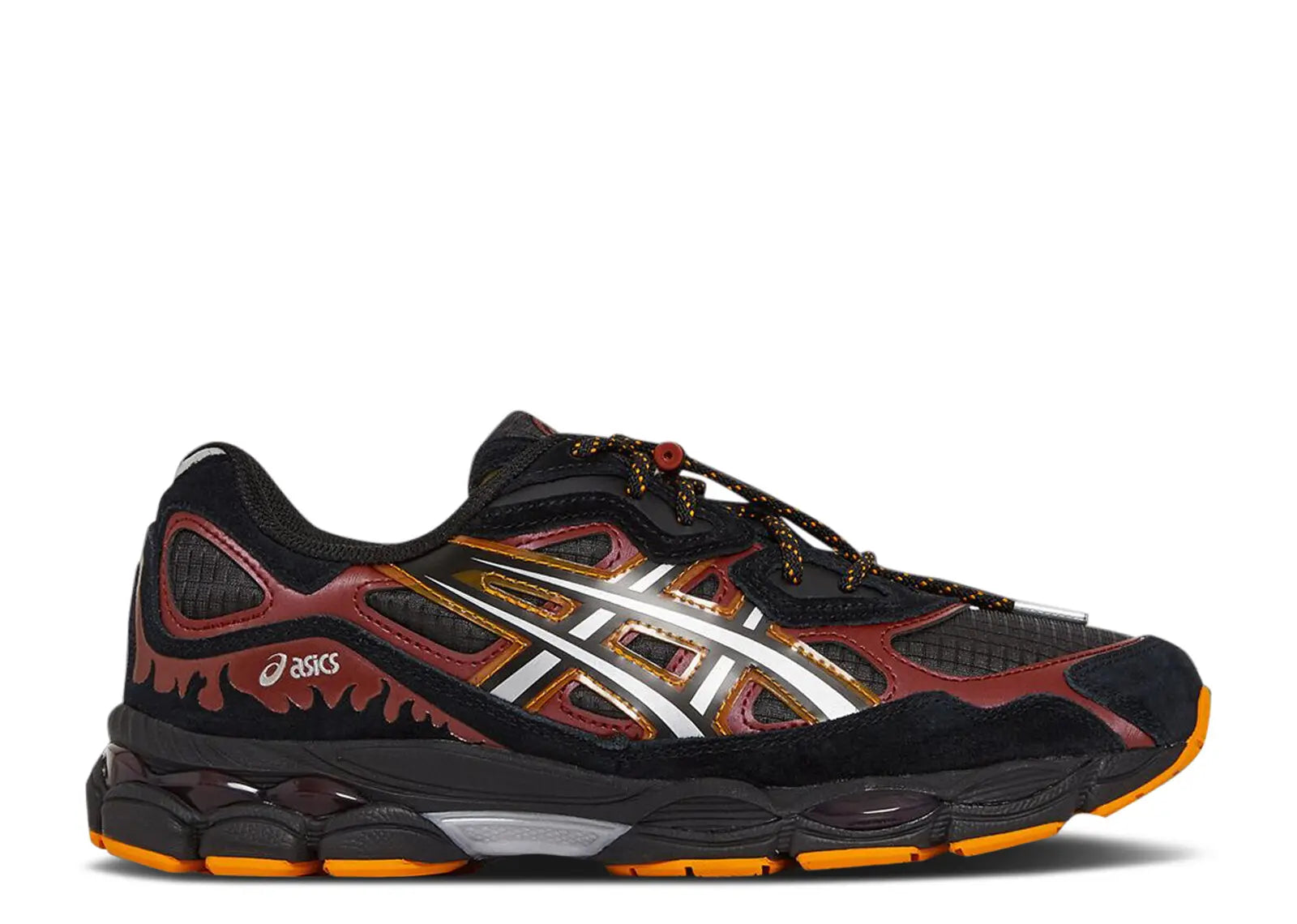 El Naruto Shippuden x ASICS GEL NYC 'Naruto Uzumaki' toma señales de diseño del personaje principal de la serie de anime. La parte superior de punto negro está asegurada con cordones de cuerda moteada y tiene capas de cuero rojo y rayas laterales blancas con ribete negro. El logotipo del clan Uzumaki está bordado en la lengua derecha, mientras que un dubrae de encaje metálico muestra el símbolo de Konoha. Los logotipos de Naruto y ASICS se turnan para decorar cada plantilla. Estos zapatos tienen una entresuela negra con amortiguación de GEL visible en el talón y el antepié.