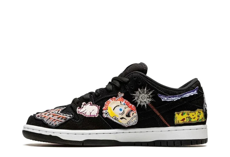 El artista de graffiti con sede en Los Ángeles Neckface vuelve a trabajar con Nike SB en un Dunk Low Pro SB. Una parte superior de ante negro es la base perfecta para una serie de parches que presentan la macabra obra de arte de Neckface en todo el zapato. Las etiquetas de la lengua cuentan con "Neck SB" y "Face SB", mientras que el zapato izquierdo presenta un gráfico de "Shockers" envuelto alrededor de la entresuela izquierda.